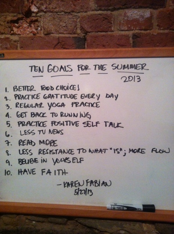 I set ten goals at the beginning of the summer. That was Memorial Day and now, we just passed July 4th. I decided to check back in and see how I was doing against the goals I had set. As you can see, some of them are more “attitudinal†goals, meaning they’re “ways of being.†Things like, “practice gratitude†“positive self-talk†“less resistance to what is†“believe in yourself†and “have faith.†Others are specific things like “watch less TV news†“read more†“get back to running†“regular yoga practice†and “make better food choices.â€